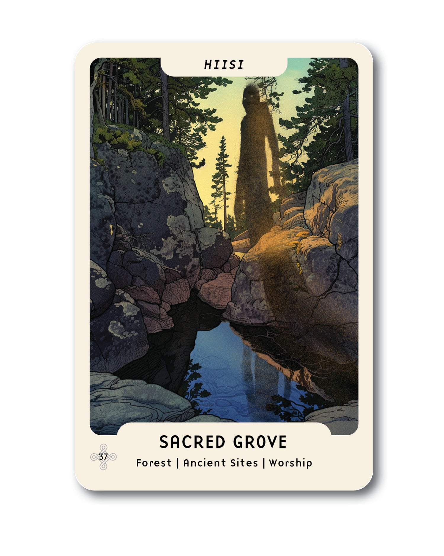 Hiisi kutsuu sinut jälleen yhteyteen luonnon ja esivanhempiesi kanssa. Se muistuttaa ikiaikaisesta viisaudesta, joka kehottaa meitä elämään sopusoinnussa ympäristömme kanssa ja näkemään luonnon pyhyyden. Kortti kehottaa pohtimaan, näetkö pyhyyttä ympärilläsi ja kohteletko luontoa kunnioituksella. Hiiden viesti on myös toiminnallinen: etsi ympäristöstäsi paikka, joka tuntuu erityiseltä, pysähdy ja kuuntele, mitä se voi opettaa sinulle. Vastaavasti voit selvittää museoviraston karttapalvelusta, onko kotisi läheisyydessä hiisiä vanhoja pyhiä metsiä tai esihistoriallisia hauta- tai rituaalipaikkoja. Kun alat tunnistaa pyhiä paikkoja ympärilläsi luonnossa, syvennät yhteyttäsi maahan, esivanhempiisi ja niihin heimoihin, jotka ovat kulkeneet täällä ennen meitä.
