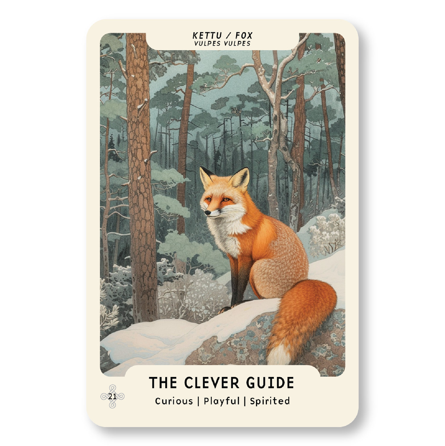 Ketun kortti edustaa leikkisän uteliaisuuden ja viisauden tasapainoa. Se muistuttaa, että elämää ei tarvitse ottaa liian vakavasti – älykkyyden rinnalla on tilaa kepeydelle, leikille ja oivaltavalle nokkeluudelle.
