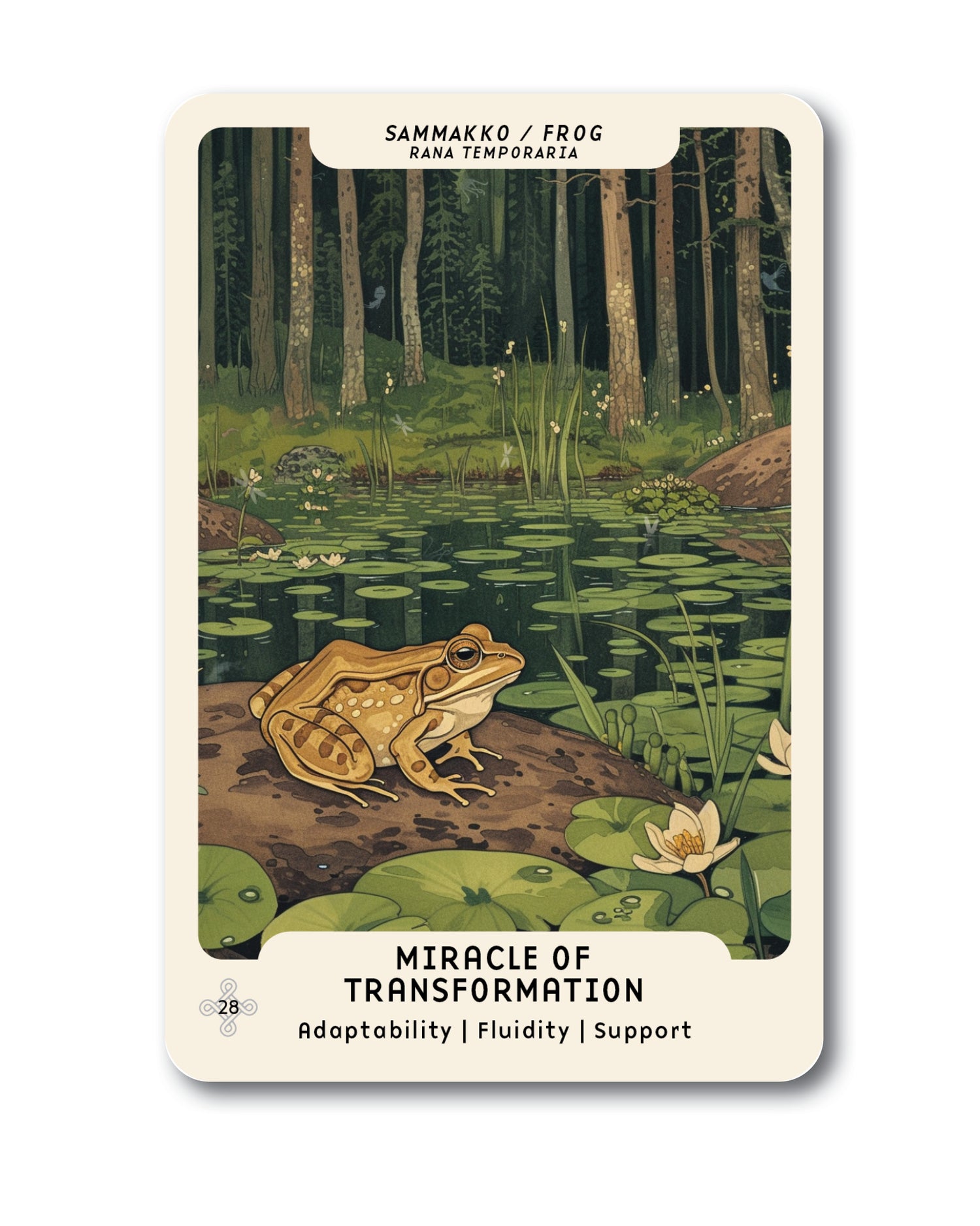 Sammakko kantaa mukanaan muodonmuutoksen salaisuutta, ja niin kannat sinäkin. Sisälläsi on piileviä kykyjä, jotka odottavat oikeaa hetkeä noustakseen näkyviin. Luota siihen, että kun aika koittaa, saat voimat käyttöön ja pääset loikkaamaan elämässäsi eteenpäin.