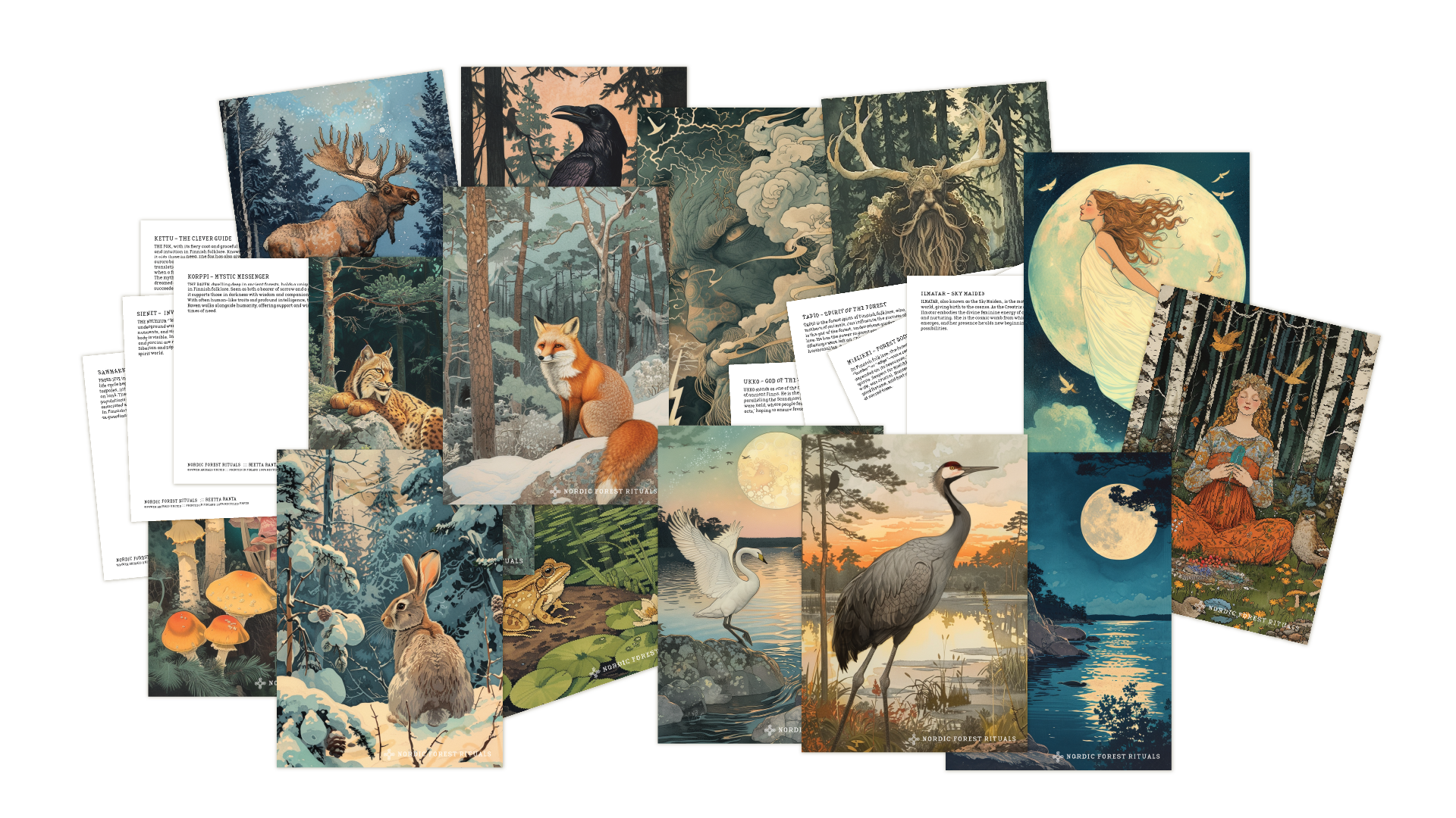 These postcards are made from thick high-quality matte paper, so they serve as a great addition to a gift or just a thoughtful written note to a friend. Each card presents one element from Finnish/Nordic nature, with a short story from the rich folklore and mythology.
